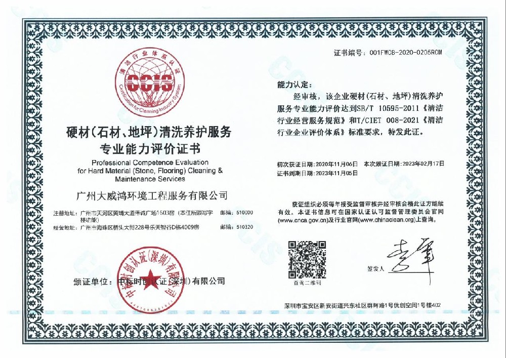 硬材(石材、地坪)清洗养护服务专业能力评价证书