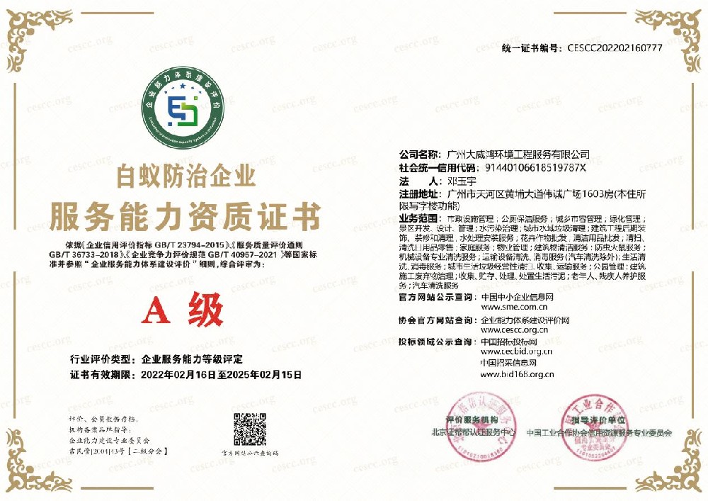 白蚁防治企业-服务能力资质证书(A级)