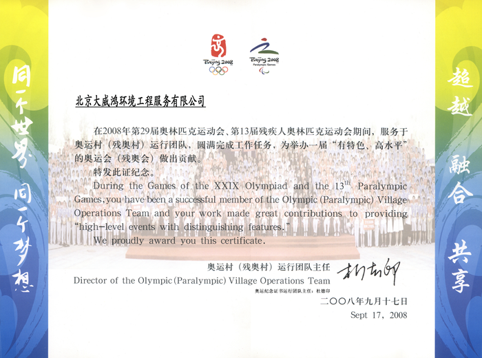2008年北京奥运荣誉证书